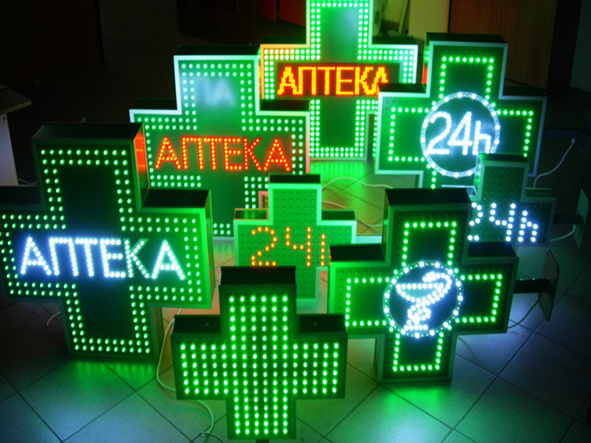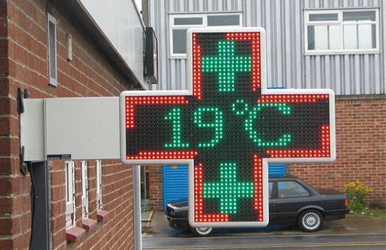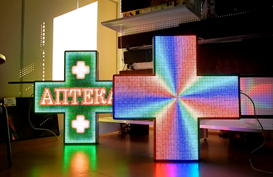 Как видим, существует большое количество аптечных крестов самого различного вида. В настоящее время особую популярность завоёвывают диджитал-конструкции, способные демонстрировать движущиеся элементы за счет светодиодных панелей.