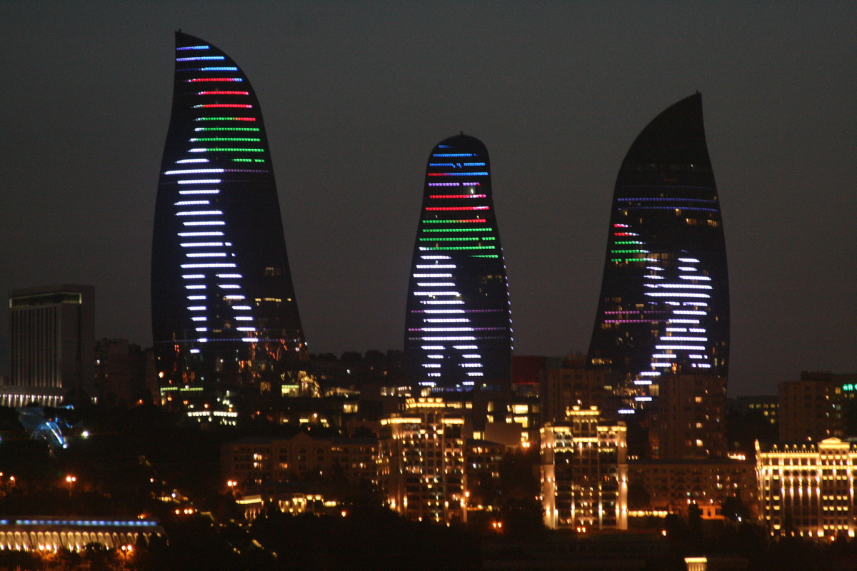 7) «Огненные Башни»/ «Пламенные Башни» (Азербайджан). Башни похожи на языки пламени. Башни окутаны светодиодным полотном. На медиафасадах транслируется огонь, вследствие чего создается впечатление огромных факелов.