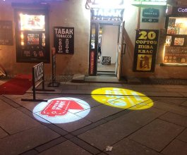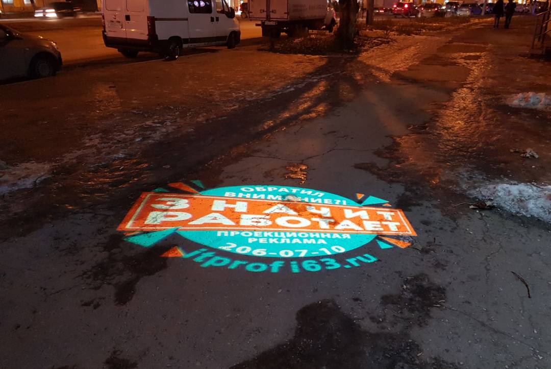 Возникает закономерный вопрос: «Что такое реклама на асфальте?». Реклама на асфальте представляет собой информационное объявление, нанесенное на тротуаре или проезжей части при помощи специальной краски и трафарета или демонстрируемое при помощи высококачественной проекции с применением специальных видеопроекторов (гобо-проекторов). Гобо-проектор – это высококачественный светодиодный проектор, способный демонстрировать как статичное изображение, так и движущуюся картинку.
