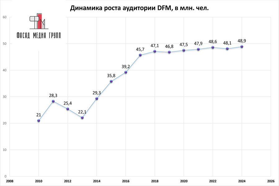Благодаря качественному, сбалансированному контенту аудитория «ДФМ» многочисленна и разнообразна. Среднее время прослушивания в день составляет более 70 мин.