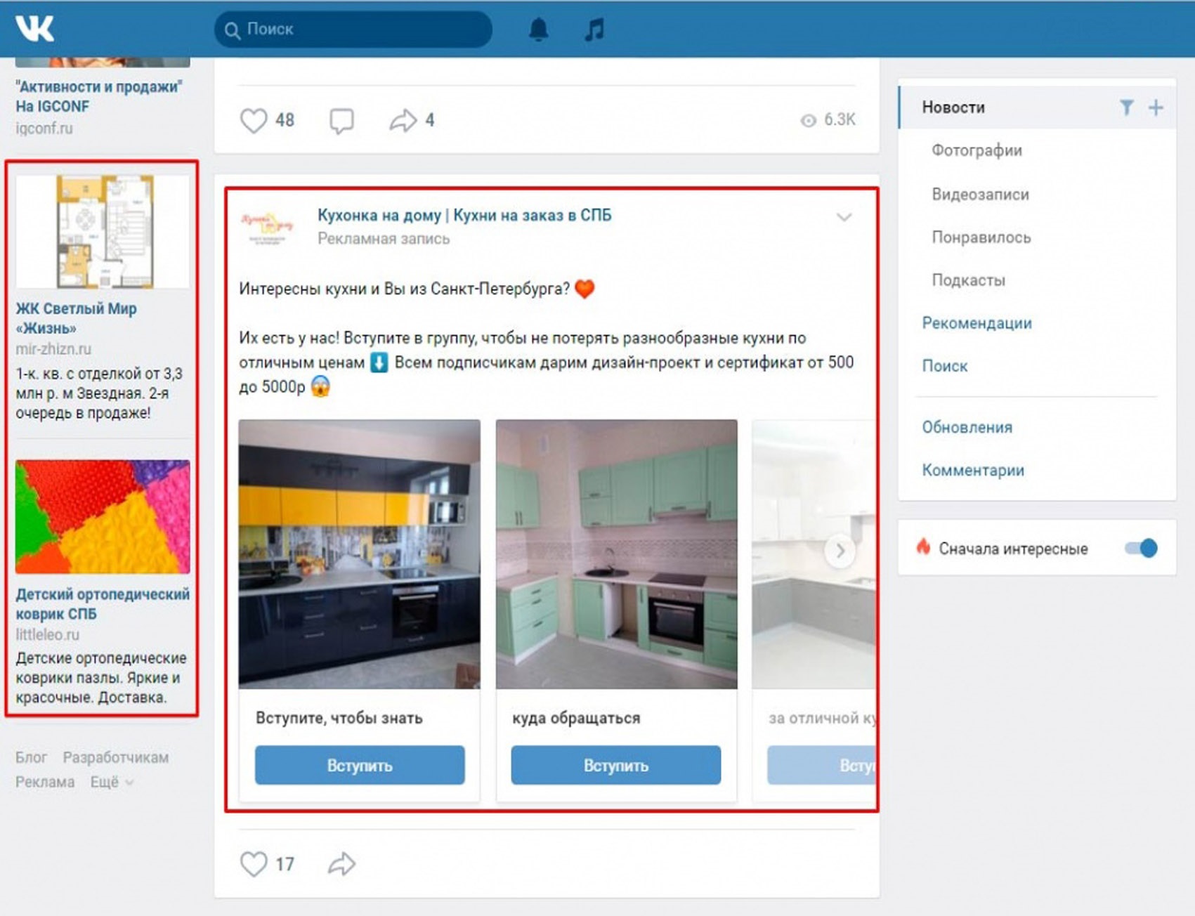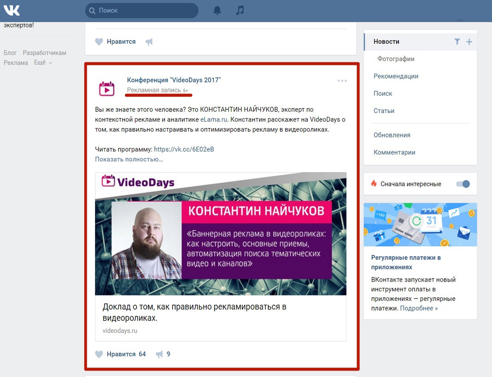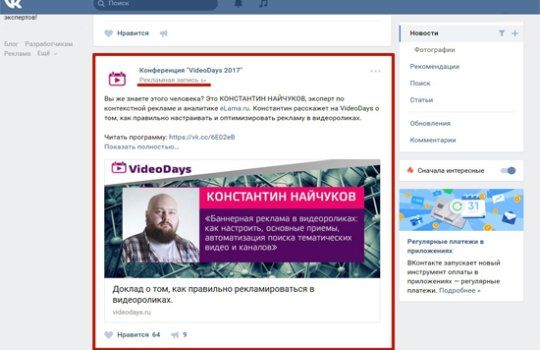Выделяют следующие виды рекламных объявлений в ВКонтакте: