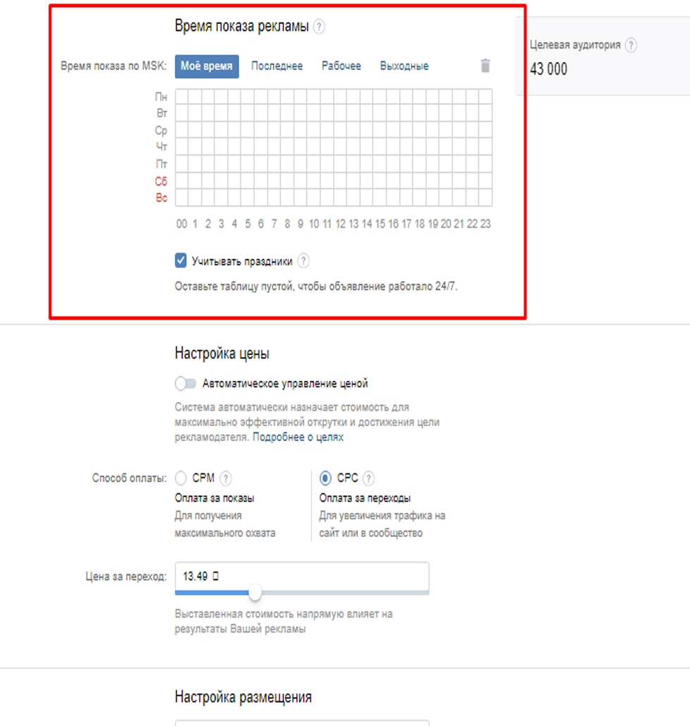 По умолчанию рекламные объявления работают круглосуточно, чтобы как можно больше людей могли их увидеть. Чтобы ваша реклама показывалась в конкретные часы и дни, задайте Время показа. Если вы не заполните таблицу с расписанием, показы будут идти круглосуточно. Показывать рекламу в будни или исключить показы ночью — выбирайте стратегию, которая поможет эффективнее решать вашу бизнес-задачу. Исключайте показ рекламы в нерабочее время — больше не будет ситуации, когда в вашей компании выходной, а пользователь увидел объявление, перешёл по ссылке, но не смог до вас дозвониться. Кроме того, настройка времени показа рекламы позволяет эффективно продвигать акции и спецпредложения. Например, ресторан может приглашать на бизнес-ланч по будням перед обедом, а салон красоты на маникюр со скидкой по утрам в выходные. Расписание рекламы позволит экономно расходовать бюджет и показывать рекламу тогда, когда клиенты активны и готовы к покупкам.