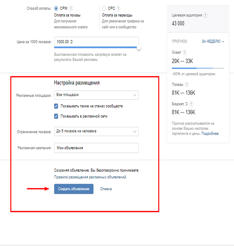 CPM или оплата за показы для получения максимального охвата. При этом, плата устанавливается за 1000 показов. Минимальная плата за показы составляет 30 руб. Максимальная – 1000 руб.
